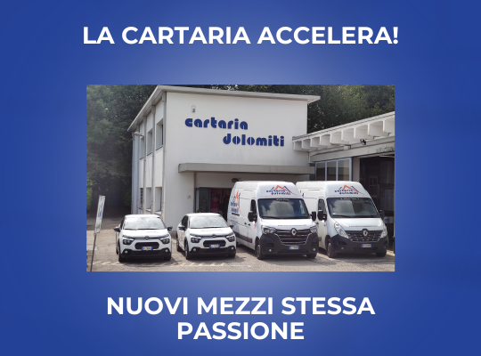La Cartaria Dolomiti si rinnova! Siamo entusiasti di annunciare l'arrivo di una nuova flotta di veicoli, un investimento importante che ci permette di offrire un servizio ancora più efficiente e puntuale ai nostri clienti.